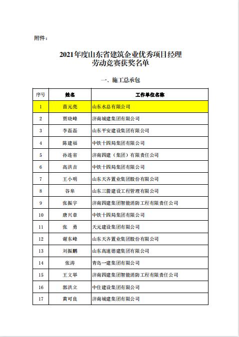 近日,由山東省建設工會和山東省建筑業協會組織開展的《2021年度山東省建筑企業優秀項目經理勞動競賽活動》落下帷幕,經雙方組成的工作委員會評議審定和綜合評審,我公司苗元亮、盧正雷、蔡國森三名同志被評為“山東省建筑企業優秀項目經理”。此項殊榮是山東省建筑行業項目經理的最高榮譽,旨在鼓勵受表彰人員再接再厲,發揮引領示范作用,創建更多精品工程。