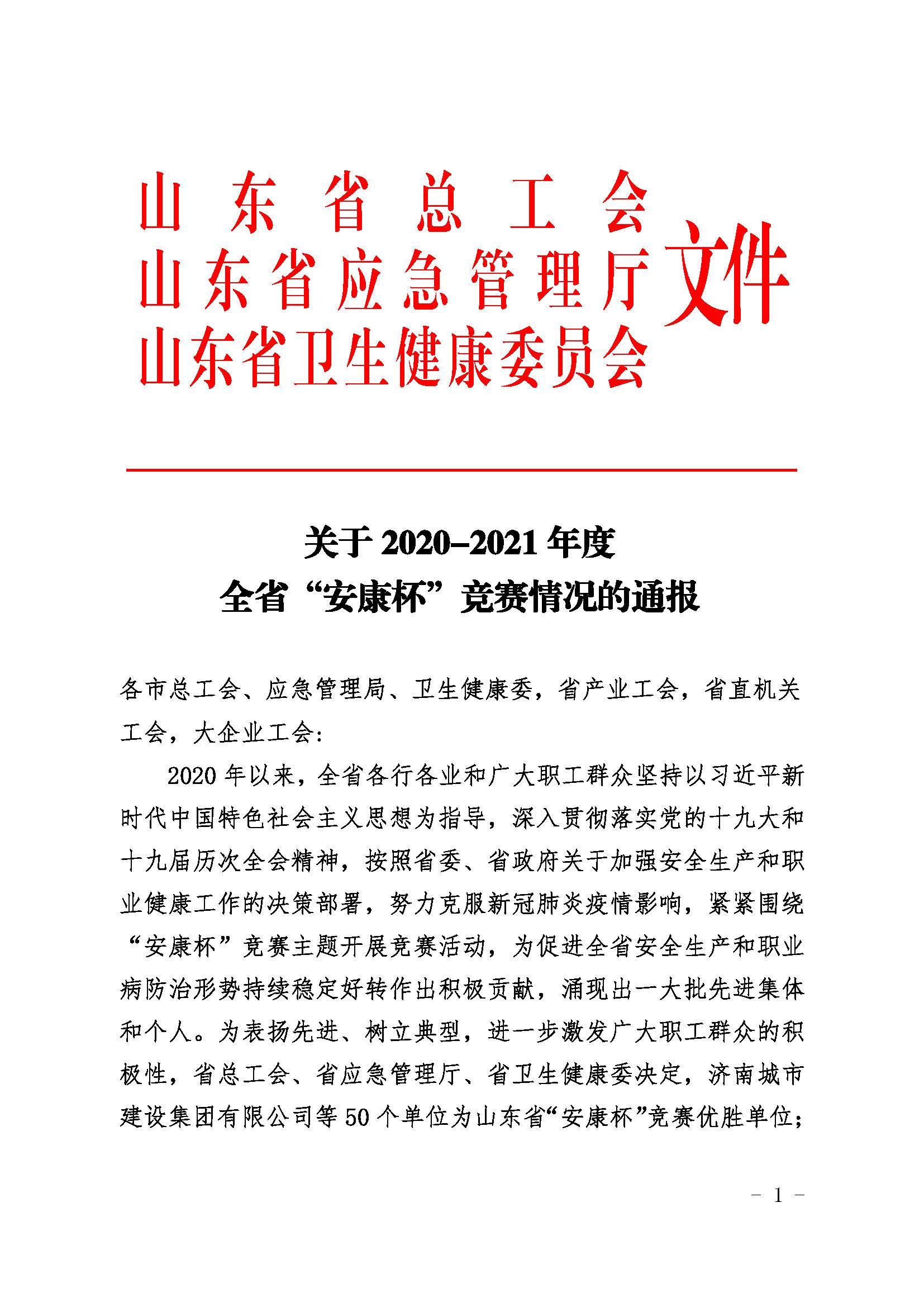 公司榮獲2020-2021年度山東省“安康杯”競(jìng)賽優(yōu)勝單位稱號(hào)