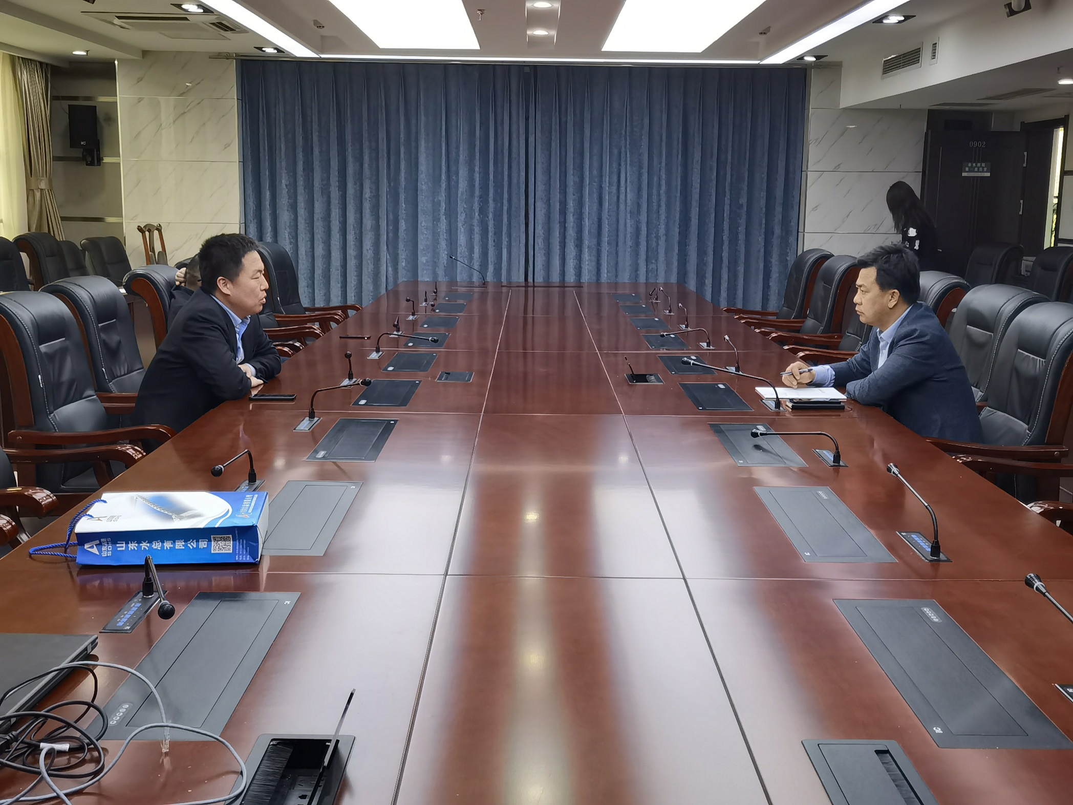 接著,靳文碩一行到膠州市水務局開展合作洽談。膠州市水務局局長王曉久、膠州市交通局局長郝強出席洽談會。會上,靳文碩表達了山東水總為膠州市水利、市政方面發展做貢獻的強烈意愿。王曉久、郝強均表示希望借助山東水總在水利、市政領域所擁有的豐富經驗和有利條件,協助推動并積極參與膠州市基礎建設項目,實現雙方互利共贏,共同開創膠州市水利、市政產業高質量發展新局面。