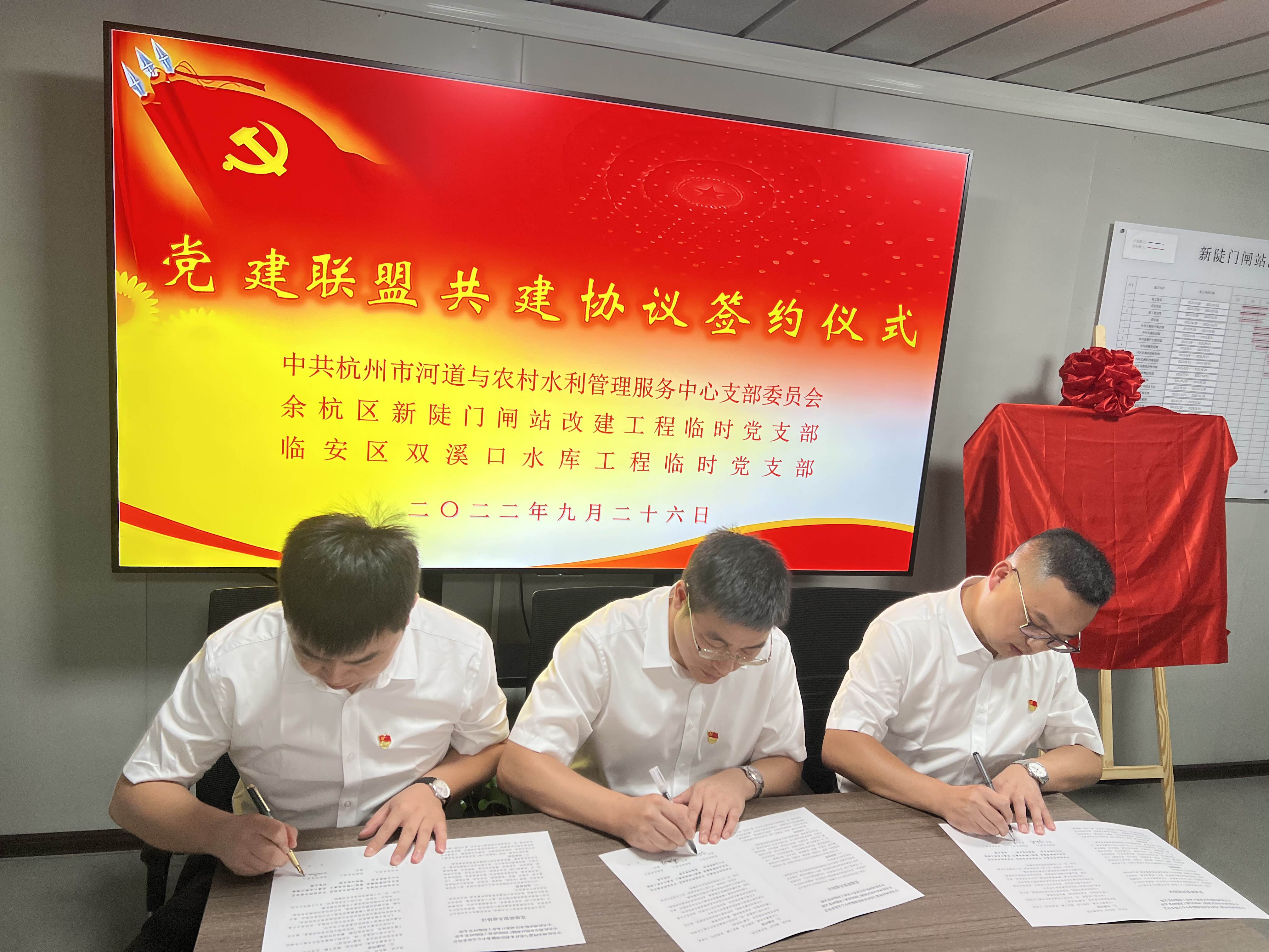 9月26日,中共杭州市河道與農村水利管理服務中心支部委員會、中共杭州市余杭區新陡門閘站改建工程臨時黨支部、中共杭州市臨安區雙溪口水庫工程臨時黨支部在新陡門閘站改建工程現場舉行黨建聯建協議簽約儀式。市農水中心支部書記、主任葉利偉,余杭區林水局黨委委員、二級調研員徐偉林,臨安水利局機關黨委副書記、紀檢書記劉勇,新陡門閘站改建工程臨時黨支部書記葛旭峰,雙溪口水庫工程臨時黨支部書記孟天琦及各支部代表參加簽約活動。