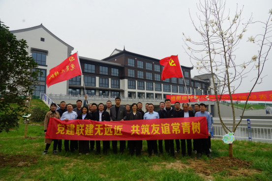在植樹現(xiàn)場,各項目管理人員、一線人員互相配合,合力完成了紫薇、桂花、山玉蘭、垂絲海棠等樹種的種植。本次活動,雙溪口水庫臨時黨支部特意從水庫帶來了“臨安山泉”澆灌大家共同種植的樹木,澆灌了各方在黨建聯(lián)建中結(jié)成的深厚情誼。三位支部書記共同為“黨建聯(lián)建友誼林”揭牌,見證了聯(lián)建工作的新起點。活動結(jié)束后,大家共同參觀了新陡門閘站,并赴石門水庫現(xiàn)場參觀交流水庫下閘蓄水等工作。
