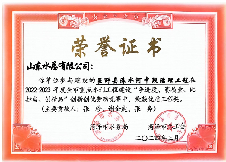近日,菏澤市水務(wù)局、菏澤市總工會公布了“2022-2023年度全市重點(diǎn)水利工程建設(shè)“爭進(jìn)度、賽質(zhì)量、比擔(dān)當(dāng)、創(chuàng)精品”創(chuàng)新創(chuàng)優(yōu)勞動競賽”獲獎名單,公司及權(quán)屬單位二局有限公司共榮獲優(yōu)質(zhì)工程1項、文明工地2項、QC成果1項,優(yōu)秀項目經(jīng)理1項。