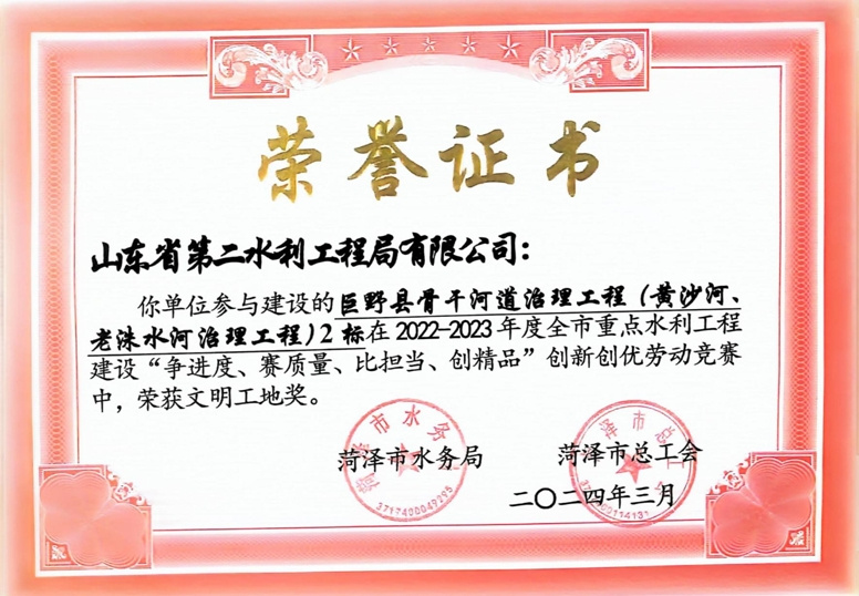 本次勞動競賽中,由二局有限公司承建的巨野縣洙水河中段治理工程榮獲“優(yōu)質(zhì)工程”獎,巨野縣二支河引調(diào)水工程、巨野縣骨干河道治理工程分別獲得“文明工地”獎;編寫的“提高混凝土擋土墻外觀質(zhì)量合格率”QC成果獲得“QC成果”獎;李云賀同志獲得“優(yōu)秀項目經(jīng)理”獎。