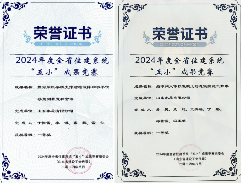近日,由山東省建設建材工會和山東省建設科技與教育協會組織的2024年度全省住建系統“五小”成果競賽發布獲獎名單,公司申報的《擋潮閘大體積混凝土動態溫控施工技術》、《攔河閘機架橋支撐結構沉降和水平位移檢測裝置和方法》等8項創新成果分別榮獲一等獎2項,二等獎2項,三等獎4項。