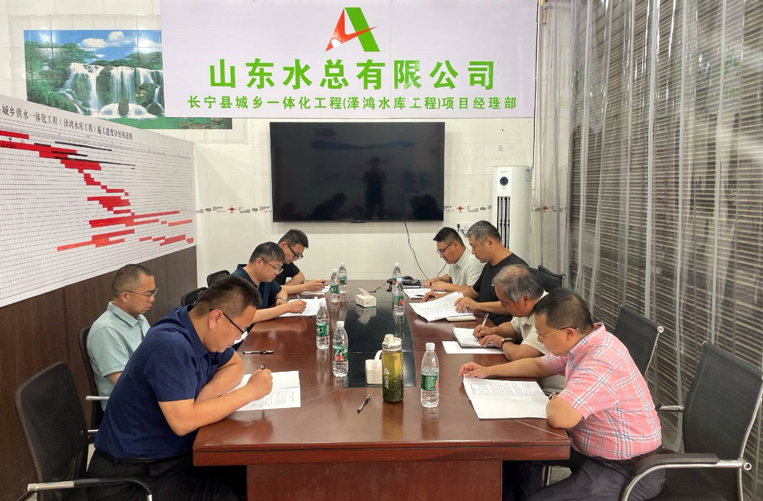 袁英杰一行深入項目施工現場,實地考察工程概況與目前進展情況。隨后會議上,項目負責人就工程進度、營收計劃、招標采購情況以及存在問題等方面進行了詳細匯報。袁英杰指出,各在建項目要嚴格控制工程進度,保證各時間節點目標順利達成,同時著重強調項目必須做好安全、質量、防汛工作。針對項目現存問題,與會人員進行了深入探討,檢查組提出切實可行的指導意見,并要求項目部及時完善收集變更索賠資料。