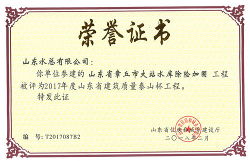 公司“山東省章丘市大站水庫(kù)除險(xiǎn)加固工程”榮獲2017年度山東省建筑質(zhì)量泰山杯