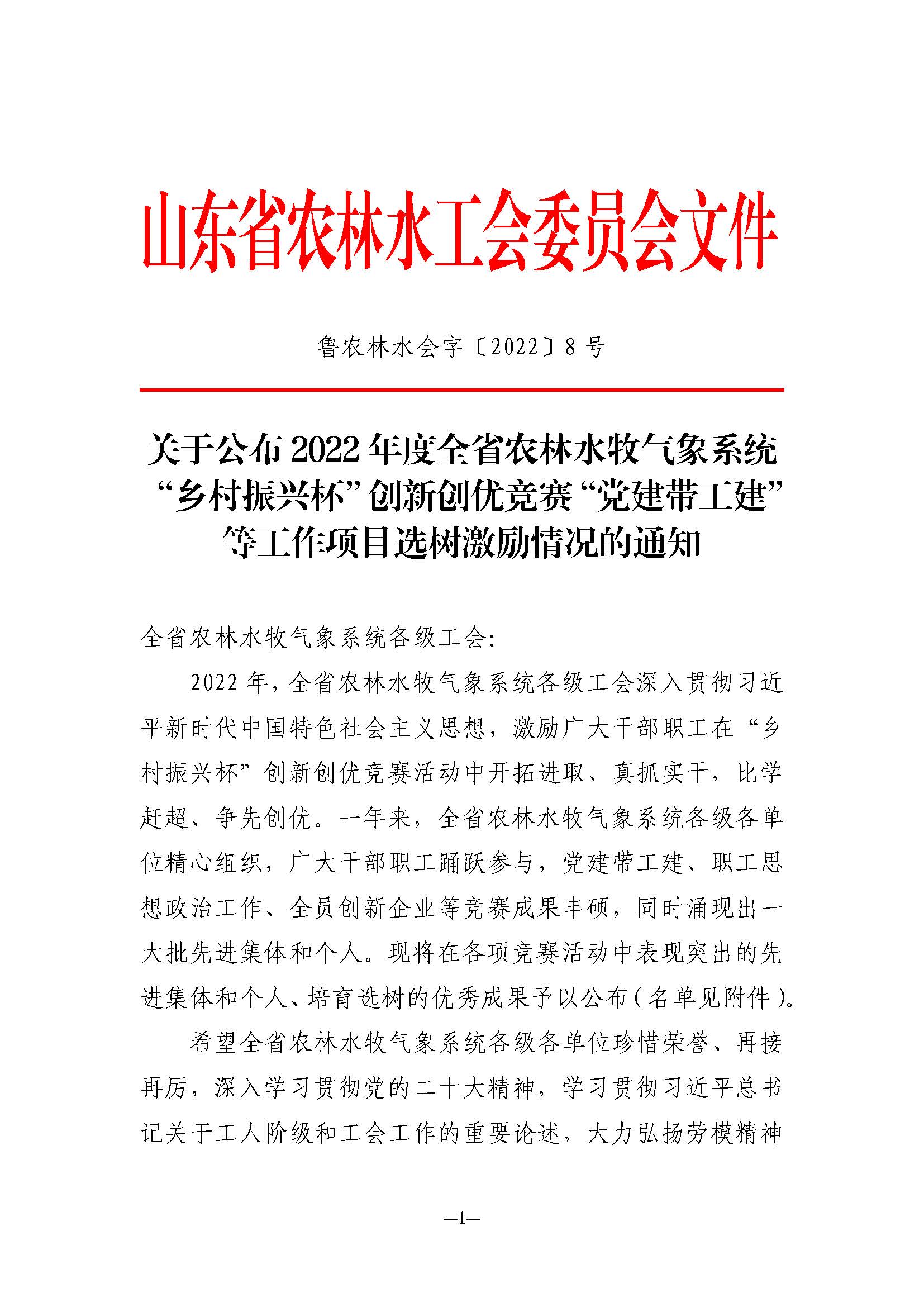 近日,山東省農(nóng)林水工會(huì)委員會(huì)下發(fā)《關(guān)于公布2022年度全省農(nóng)林水牧氣象系統(tǒng)“鄉(xiāng)村振興杯”創(chuàng)新創(chuàng)優(yōu)競(jìng)賽等工作項(xiàng)目選樹激勵(lì)情況的通知》,對(duì)涌現(xiàn)出的先進(jìn)集體、個(gè)人和優(yōu)秀案例予以通報(bào)表?yè)P(yáng)。第六分公司報(bào)送的《以“黨建+”系列活動(dòng)為抓手 實(shí)施“黨建帶工建項(xiàng)目化”管理》和基礎(chǔ)公司報(bào)送的《黨建帶工建 攜手共建》兩個(gè)案例榮獲“黨建帶工建、工建促黨建”優(yōu)秀案例;第二分公司報(bào)送的《堅(jiān)持以人為本 結(jié)合實(shí)際開展職工思想政治工作》榮獲“職工思想政治工作”優(yōu)秀案例;劉永恩同志榮獲第二屆“身邊的愛崗敬業(yè)榜樣”;蘇強(qiáng)、謝金虎、李云賀同志榮獲“職工安全隱患排查競(jìng)賽優(yōu)秀個(gè)人”。