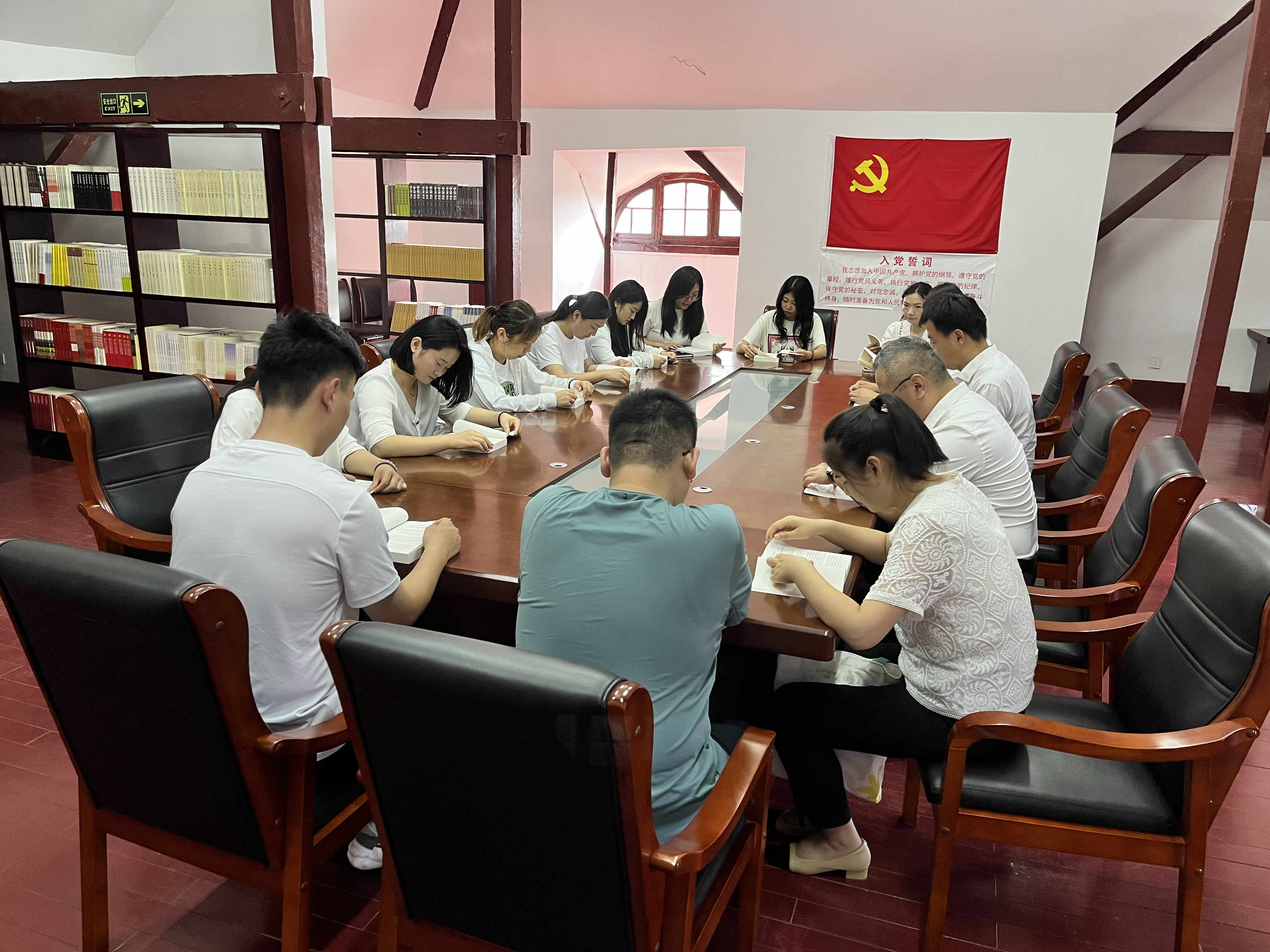 參觀結束后,全體黨員面對黨旗,舉起右手,莊嚴宣誓,大家的心一如加入中國共產黨的那一刻赤誠。隨后在紀念館閱覽室開展了一次特殊的主題教育集中學習,共同學習了《習近平新時代中國特色社會主義思想專題摘編》部分章節內容,并結合本次參觀內容暢談心得體會。