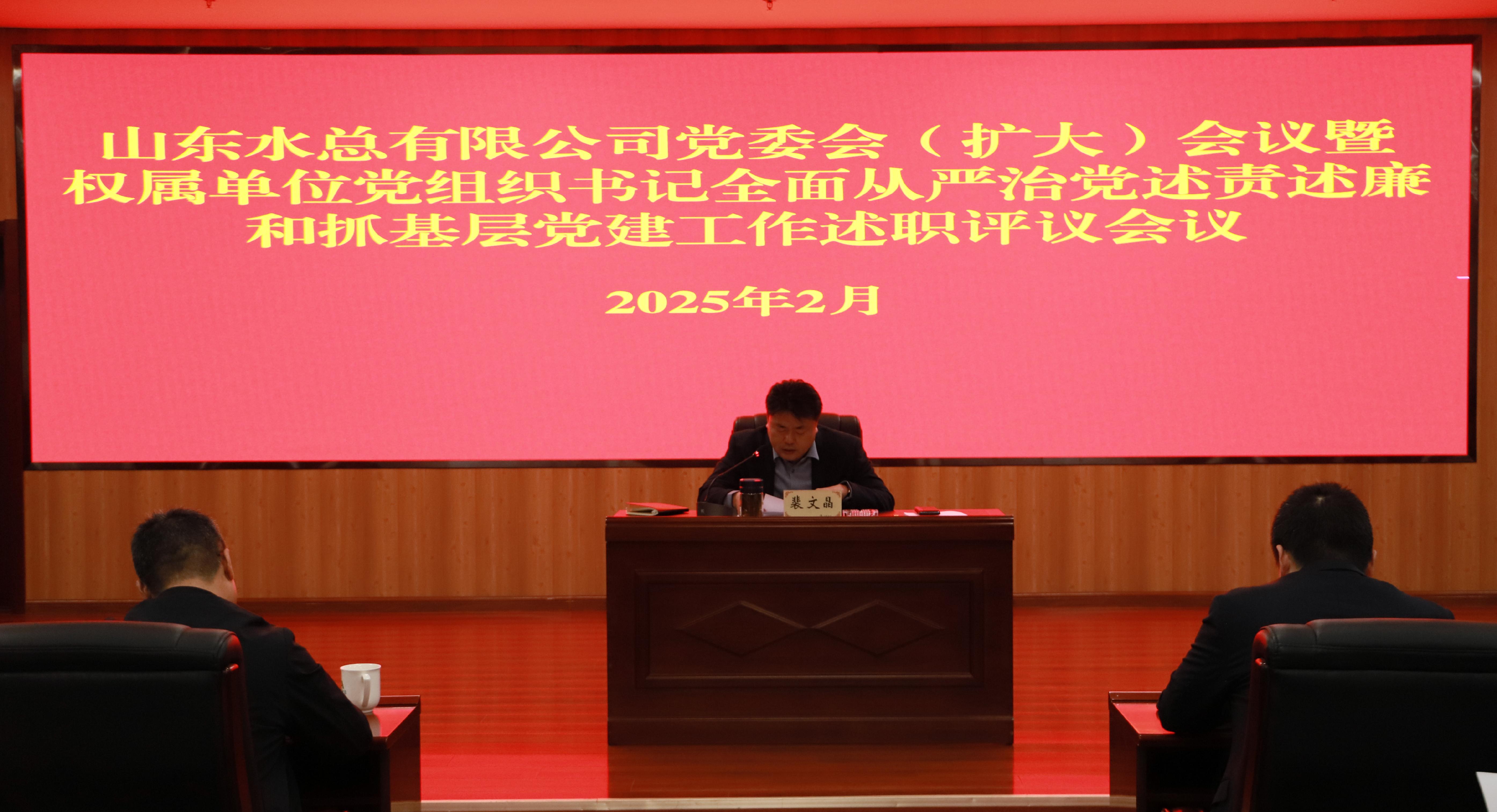 2月6日,山東水總有限公司召開黨委(擴大)會議,分別聽取權屬單位黨支部書記2024年度全面從嚴治黨述責述廉和抓基層黨建工作述職,并進行現場評議。山東水總有限公司黨委書記、董事長裴文晶同志主持會議并講話,公司黨委班子成員及高管、總部有關部室負責人及權屬單位黨組織書記和基層黨員代表參會。